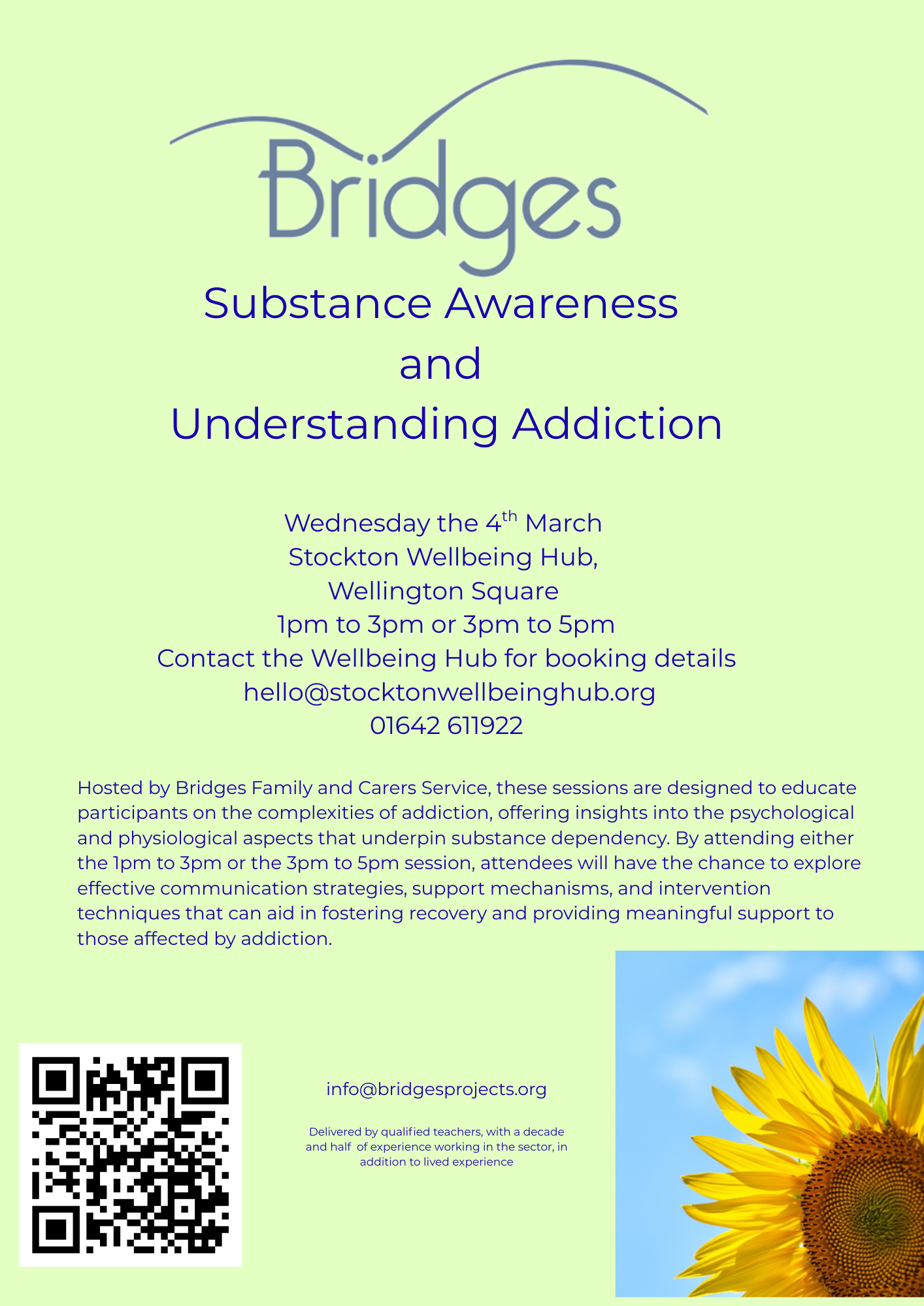 If you want to learn more about substance awareness and gain a greater understanding of addiction, come along to the Wellbeing Hub on Wednesday the 4th of March for one of the below sessions hosted by the brilliant Bridges Family and Carers Support.
